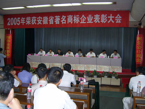 2006年7月26日下午,馬鞍山市2005年獲省著名商標(biāo)企業(yè)表彰大會(huì)在市政府東二樓會(huì)議室舉行,出席本 次會(huì)議的主要領(lǐng)導(dǎo)有省工商局副局長(zhǎng)黃家華、市人大常委會(huì)副主任杜永田、市政府副市長(zhǎng)劉榮華、市政協(xié) 副主席孫文植、市政府副秘書長(zhǎng)王興無、省工商局商標(biāo)局局長(zhǎng)劉國建等。